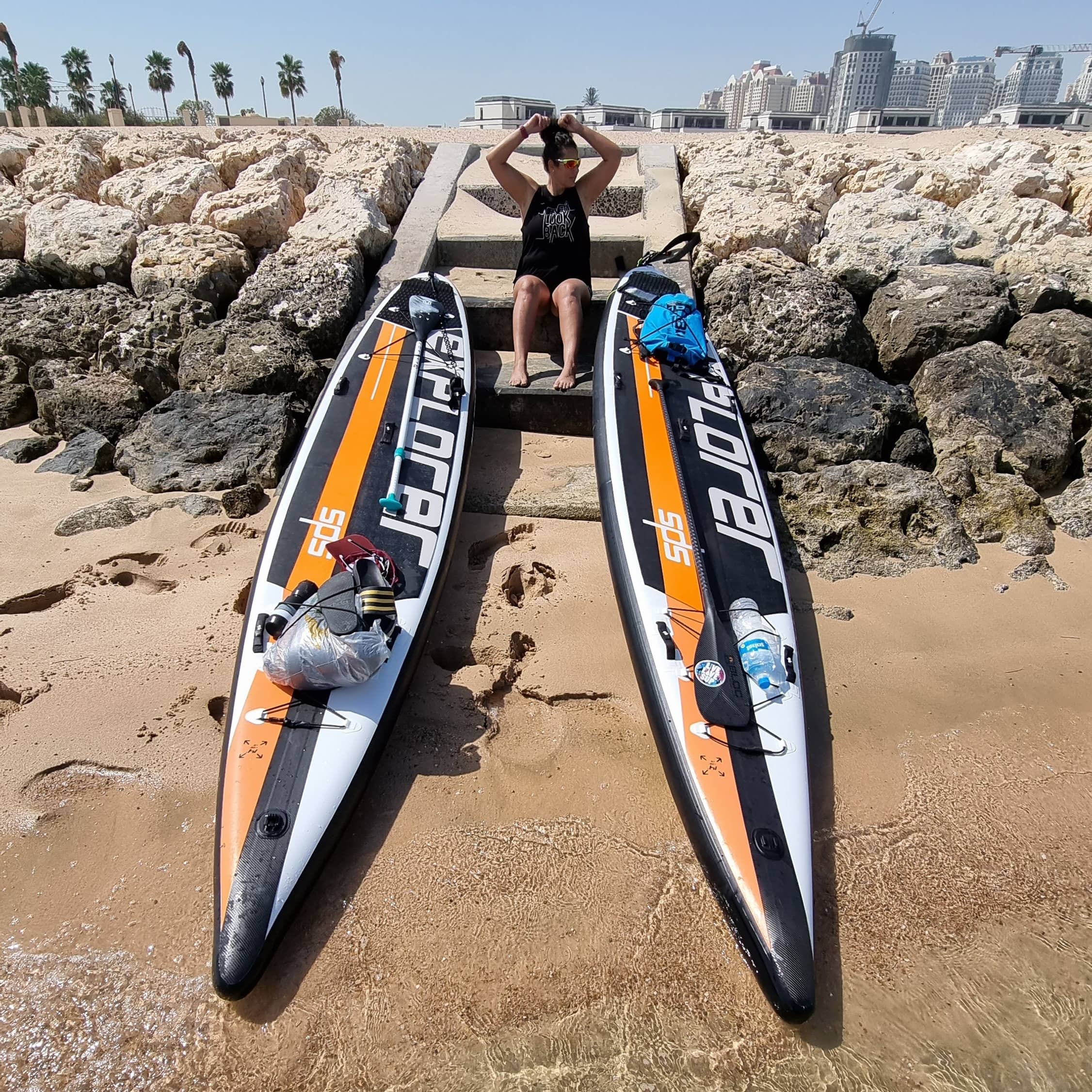 Fuimos a dos diferentes islas una tenía el gran símbolo de la copa del mundo 2022 y la otra no tenia nada, ni era prohibida y hasta tenia sombrillas…..por fin algo de tierra y sombra. Comimos pasta que Alex había preparado y estaba delicioso, también teníamos hambre ya llevábamos 6h remando aunque fuese a ritmo tranquilo. No nos quedaba mucha agua para poder proseguir mucho tiempo así que decidimos acortar a 20km nuestra vuelta porque estábamos tan felices, maravillado por esa bahía e isla: de repente, Doha nos pareció una ciudad increíble. Ambos fuimos impresionado por el otro lado bonito de Doha y queremos seguir descubriendo más antes de que el calor y el viento nos impida salir de nuevo. Lo que mas me hace feliz es que mi amigo por fin encontró paz espiritual a través nuestro maravilloso deporte y yo fe en la humanidad. No hay mejor terapia que la “Vitamin sea y el deporte”.
