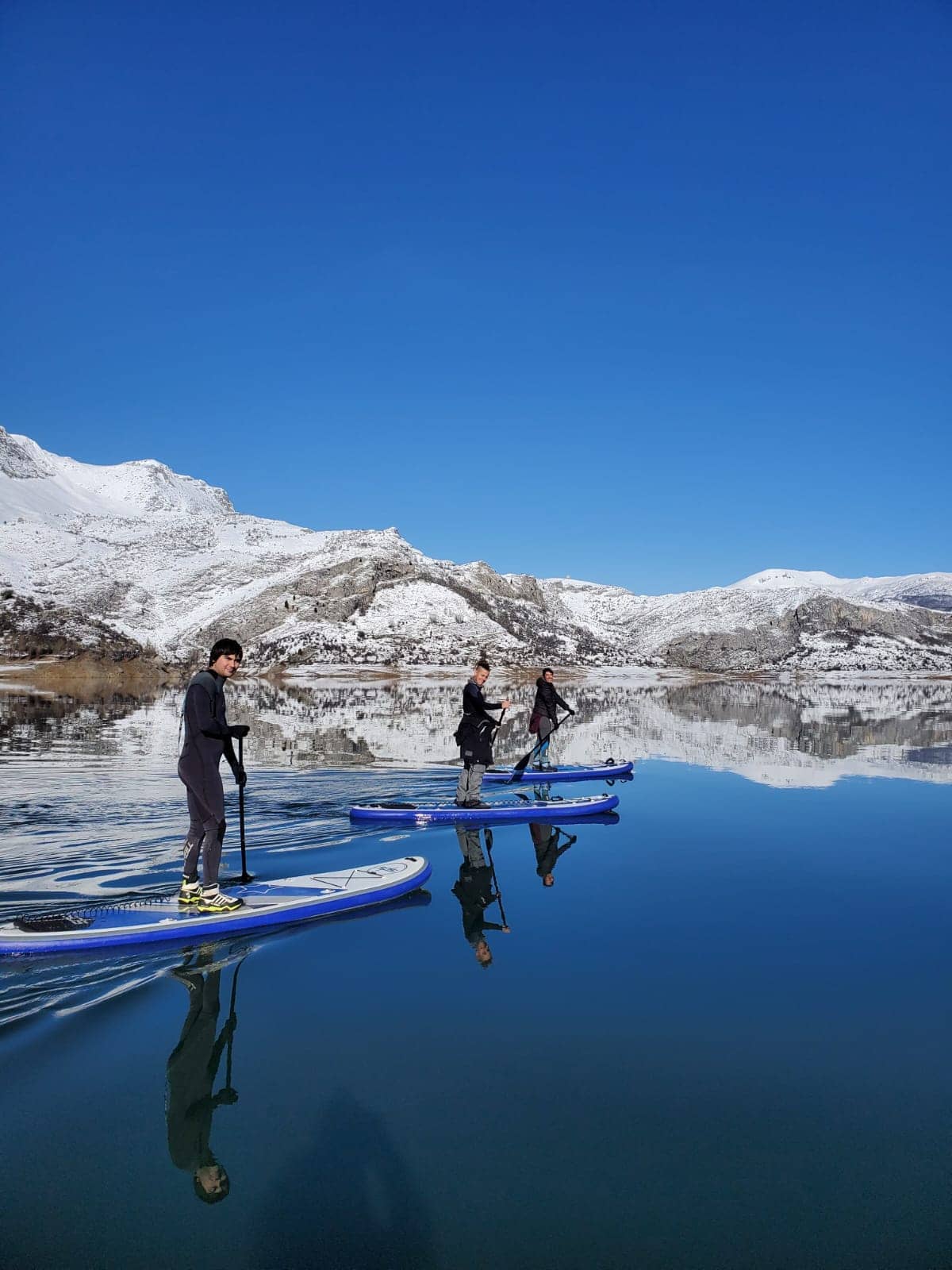 This reservoir provides us with different route options depending on the wind conditions we have, so with its 100km of coastline we consider the best option. From the water we enjoyed the silence, the magic of having impressive peaks above us with snow, even waterfalls that in those temperatures have turned into snow stalactites. 2 hours paddling, connecting with ourselves, with the nature that surrounds us.